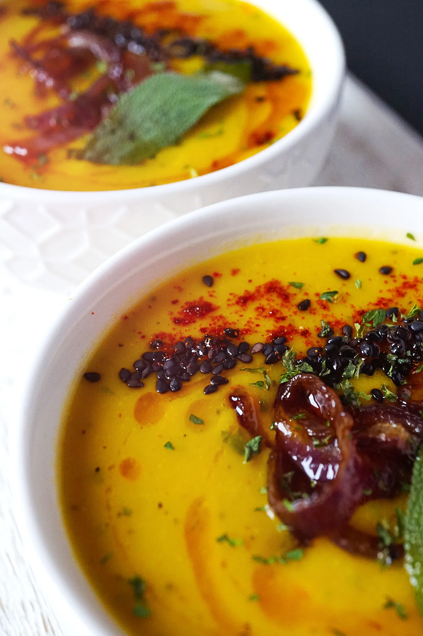 - Throw the caramelized onions, squash, garlic and vegetable stock into high-speed blender. Blitz for 2-3 minutes.
