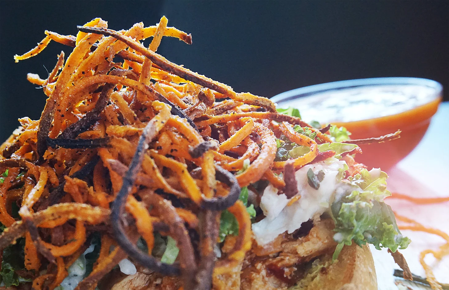 - To build your sandwich, start with the chicken, then the slaw and top it with the spiralized sweet potato. Serve and enjoy!