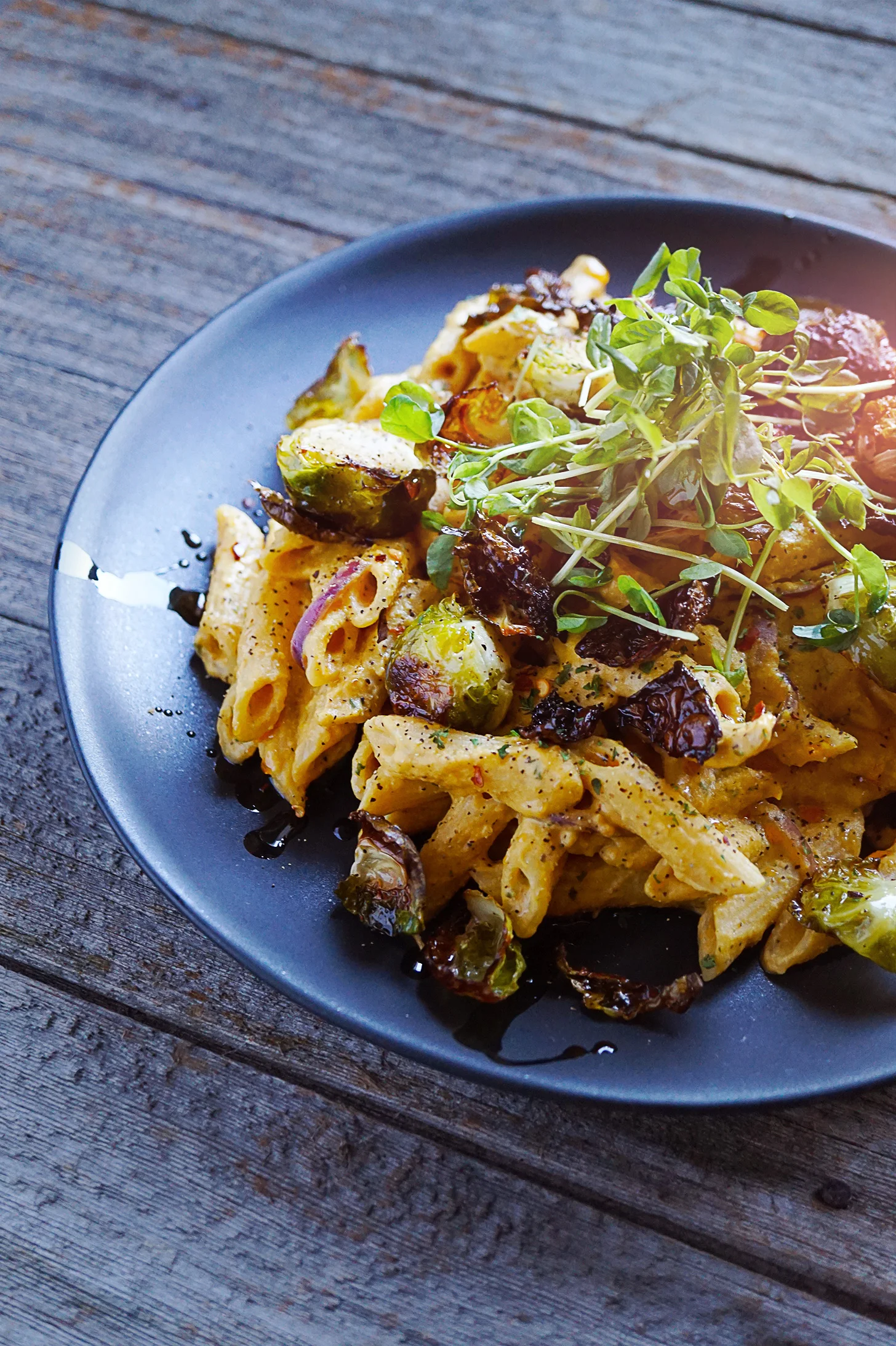 Creamy Pumpkin Pasta with Roasted Brussels Sprouts