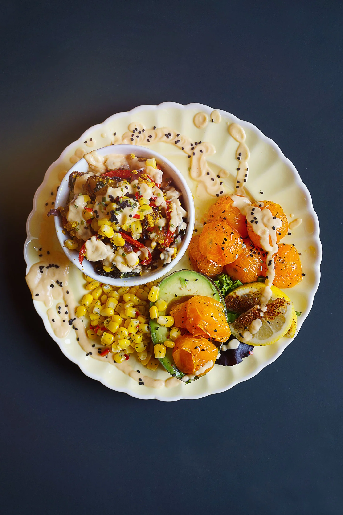- Combine the potato hash and tofu scramble. Plate and drizzle the cauliflower cheese sauce over top.