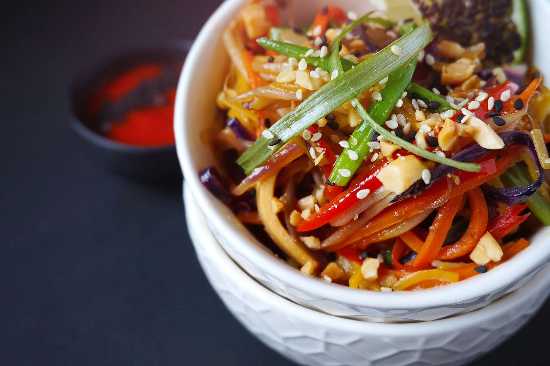 - Heat a wok or large/deep pan with sesame oil on medium-high heat. When the oil is hot, toss in all the vegetables except bean sprouts and green onions.