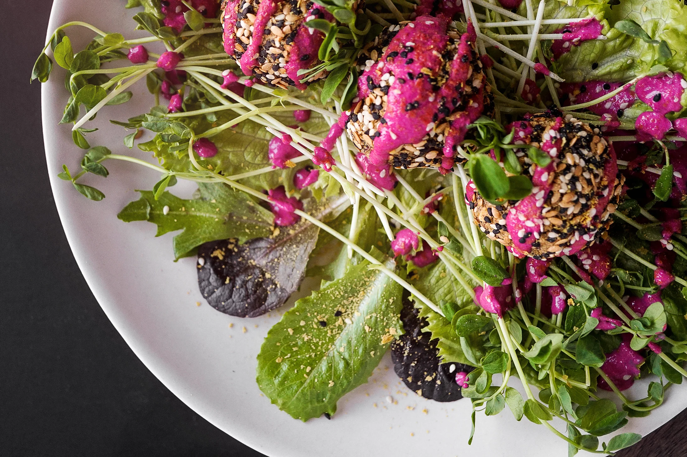 A healthy blend of crunch and freshness with these baked sesame falafel balls. Topped with a gorgeous pink tahini sauce, perfect for Valentine's day, or any day for that matter!