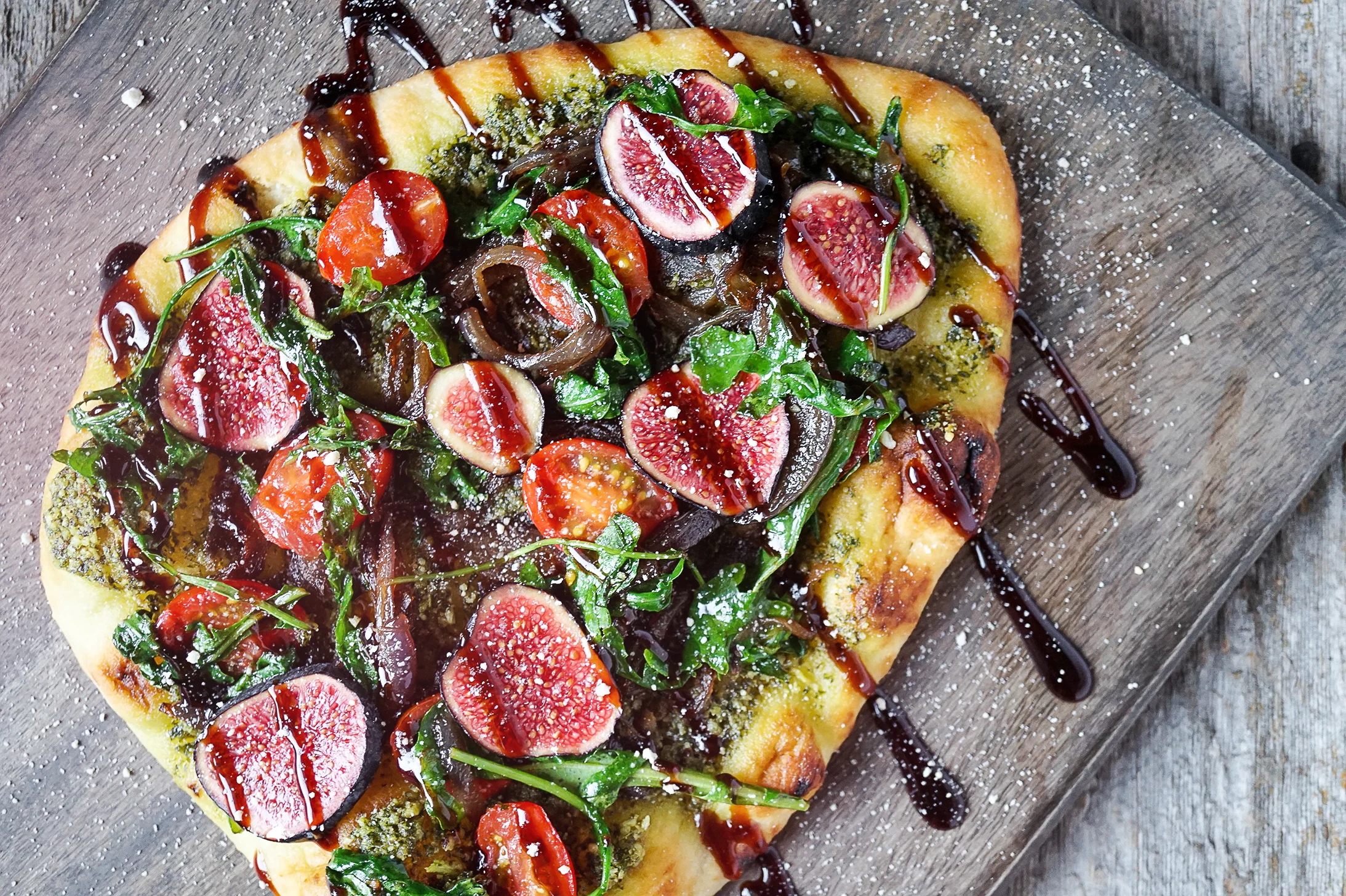 - Add the freshly sliced figs and drizzle with the balsamic glaze (or balsamic vinegar). Feel free to sprinkle with vegan parmesan. Serve immediately.
