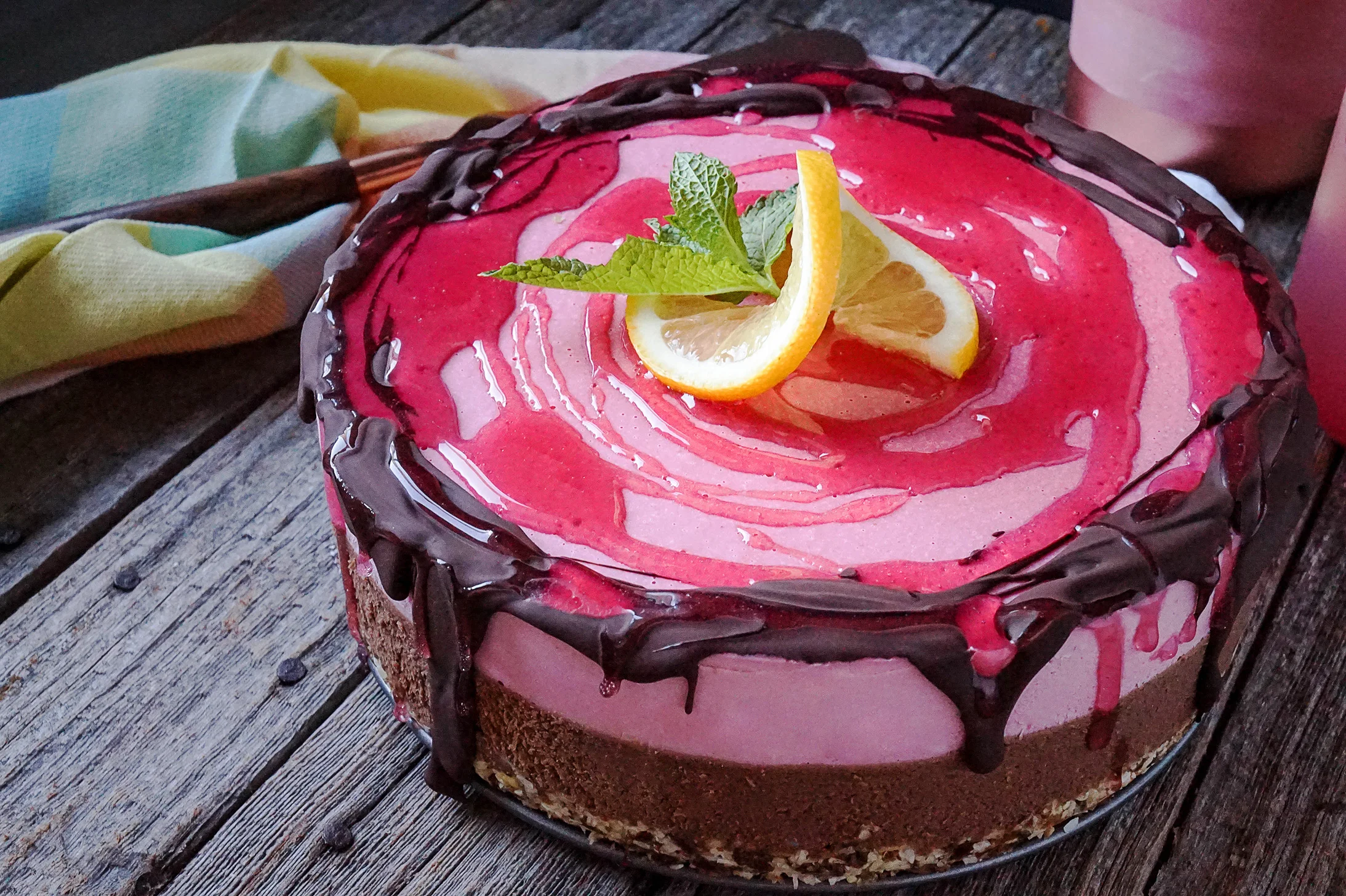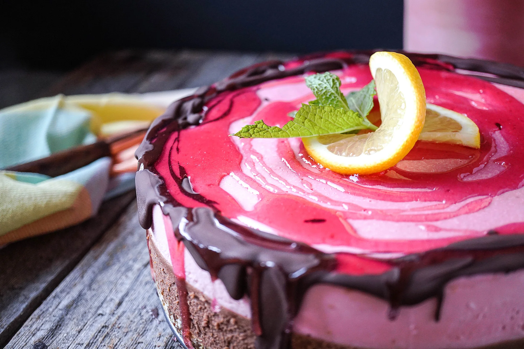 - Drizzle chocolate and pink glaze over the cheesecake as desired. Add a slice of lemon and mint leaves to create a beautiful contrast of colours.